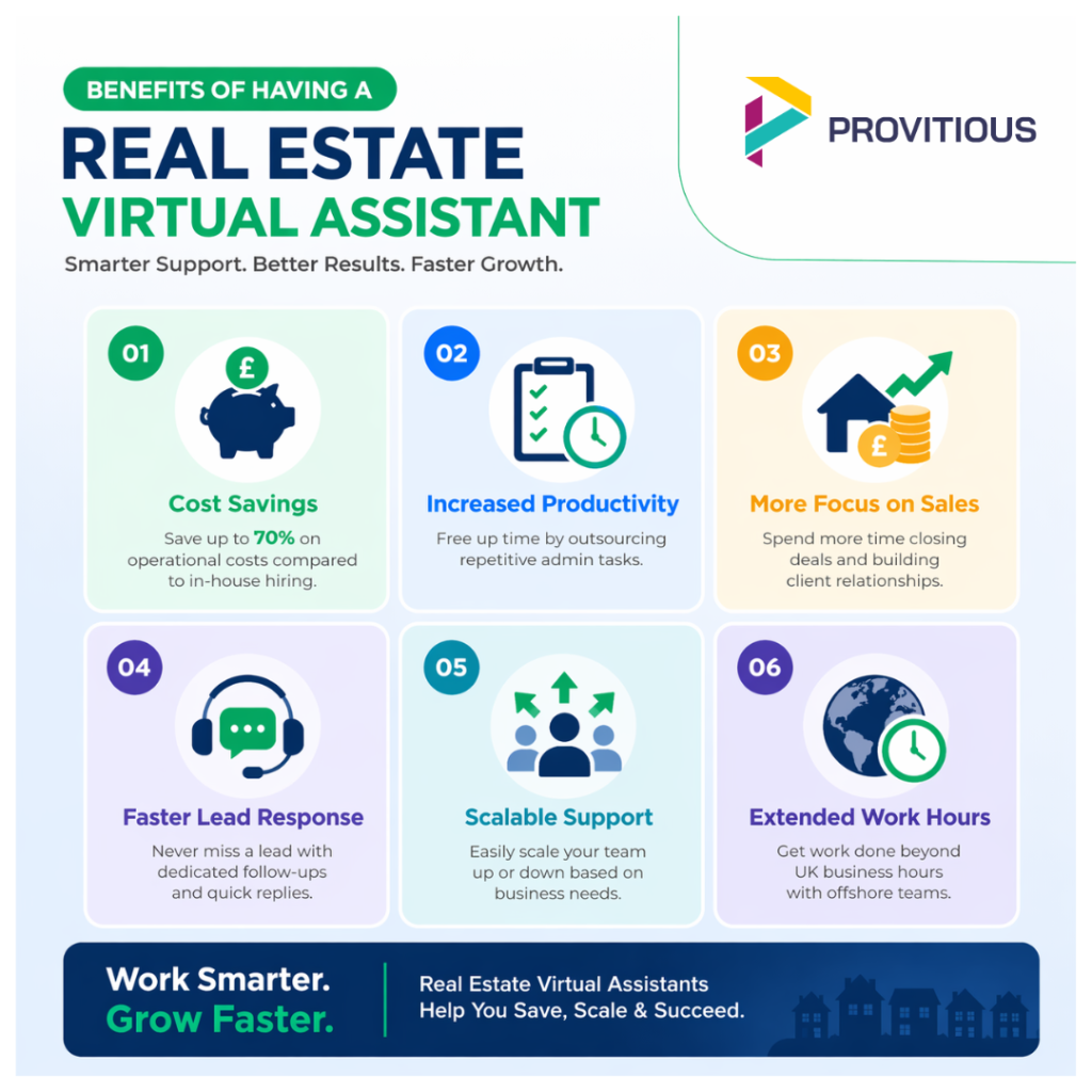 For UK-based real estate businesses, offshore virtual assistants provide the same services at a significantly reduced cost.